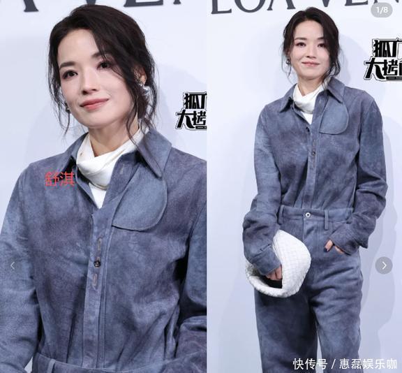 舒淇那天穿了件今年秋冬新出的蓝灰色麂皮连体裤,里面搭配了个白色高领打底,手里还提着个白色编织纹的手包。